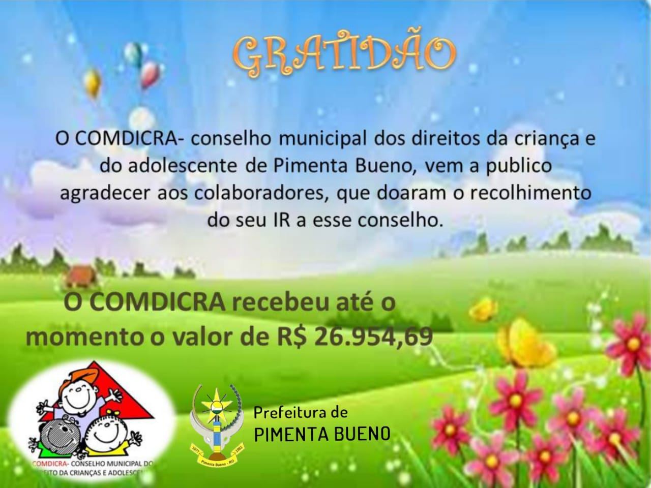 A Prefeitura Municipal de Pimenta Bueno através do Comdicra - Conselho municipal dos direitos da criança e do adolescente de Pimenta Bueno, vem a público agradecer aos colaboradores que doaram o recolhimento do seu IR a esse conselho.