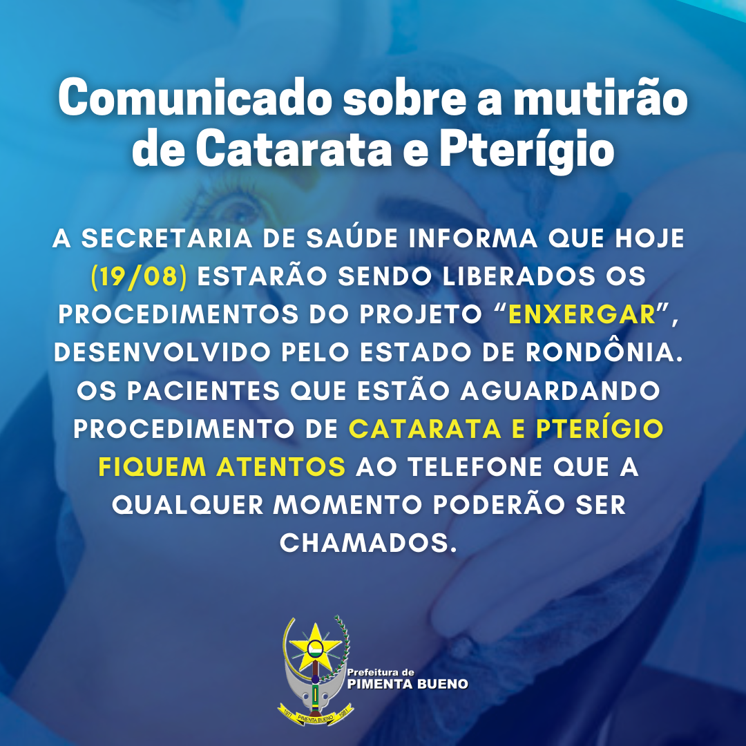 Os pacientes que estão aguardando procedimento de CATARATA e PTERÍGIO fiquem atentos ao telefone que a qualquer momento poderão ser chamados.