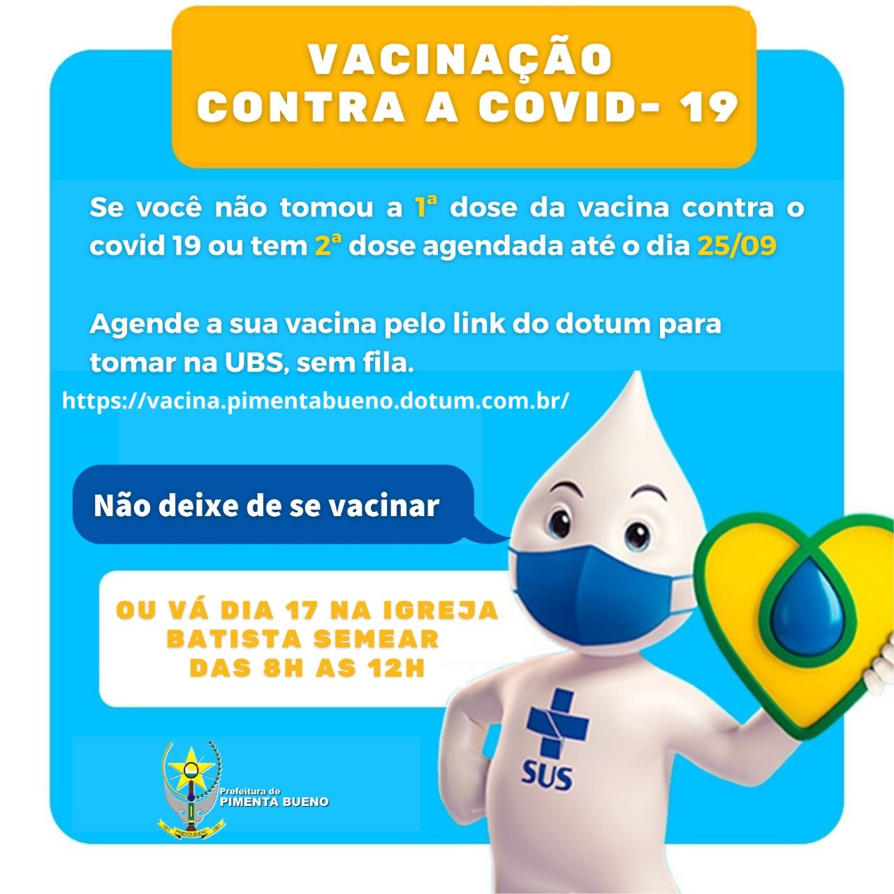 Se você ainda não tomou a 1ª dose da vacina contra o Covid 19 ou tem 2ª dose agendada até o dia 25/09 agende a sua vacina pelo link do Dotum para tomar na UBS, sem fila.