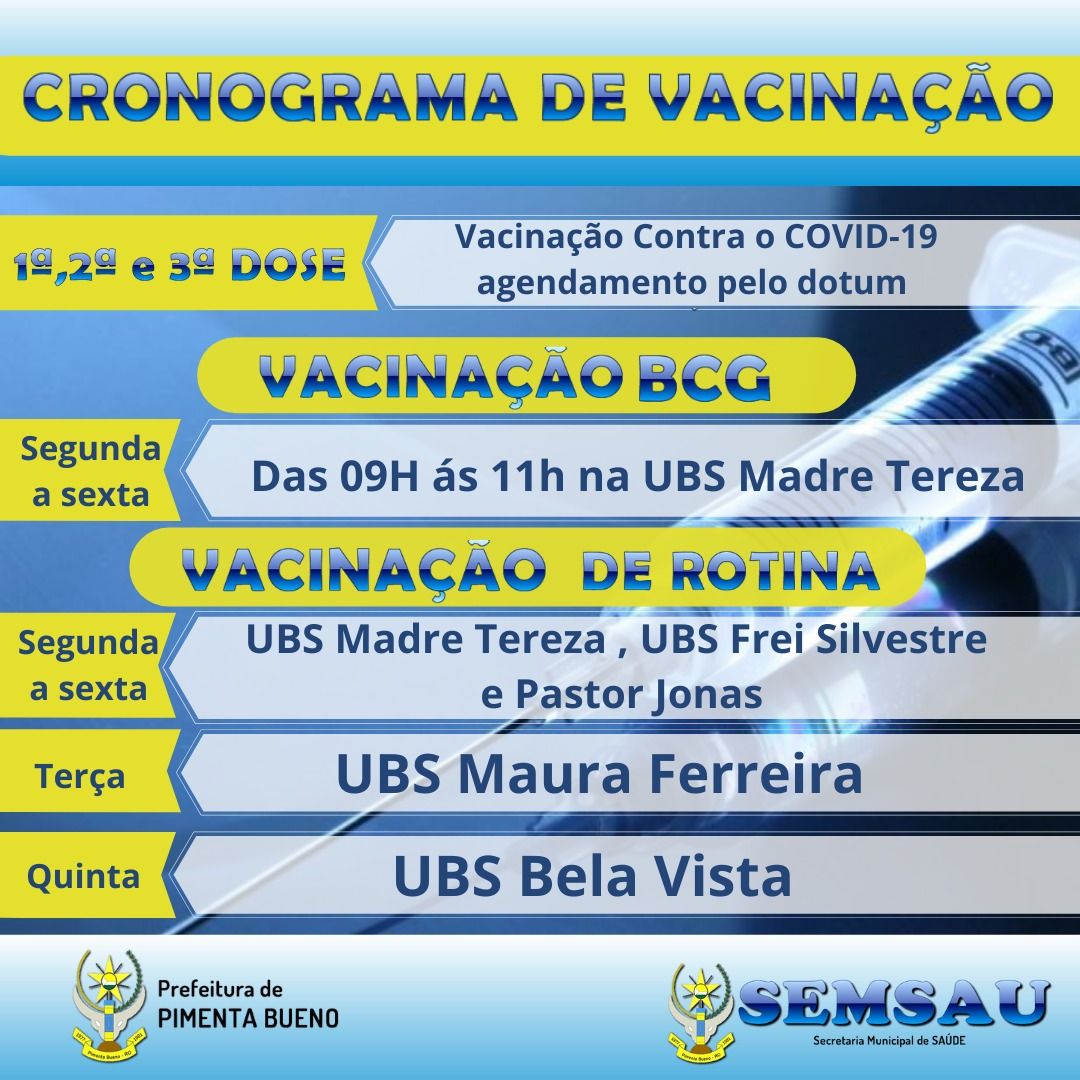 Confira o cronograma de vacinação da Secretaria de Saúde de Pimenta Bueno para as vacinas de rotina, BGC, e contra o Covid-19.