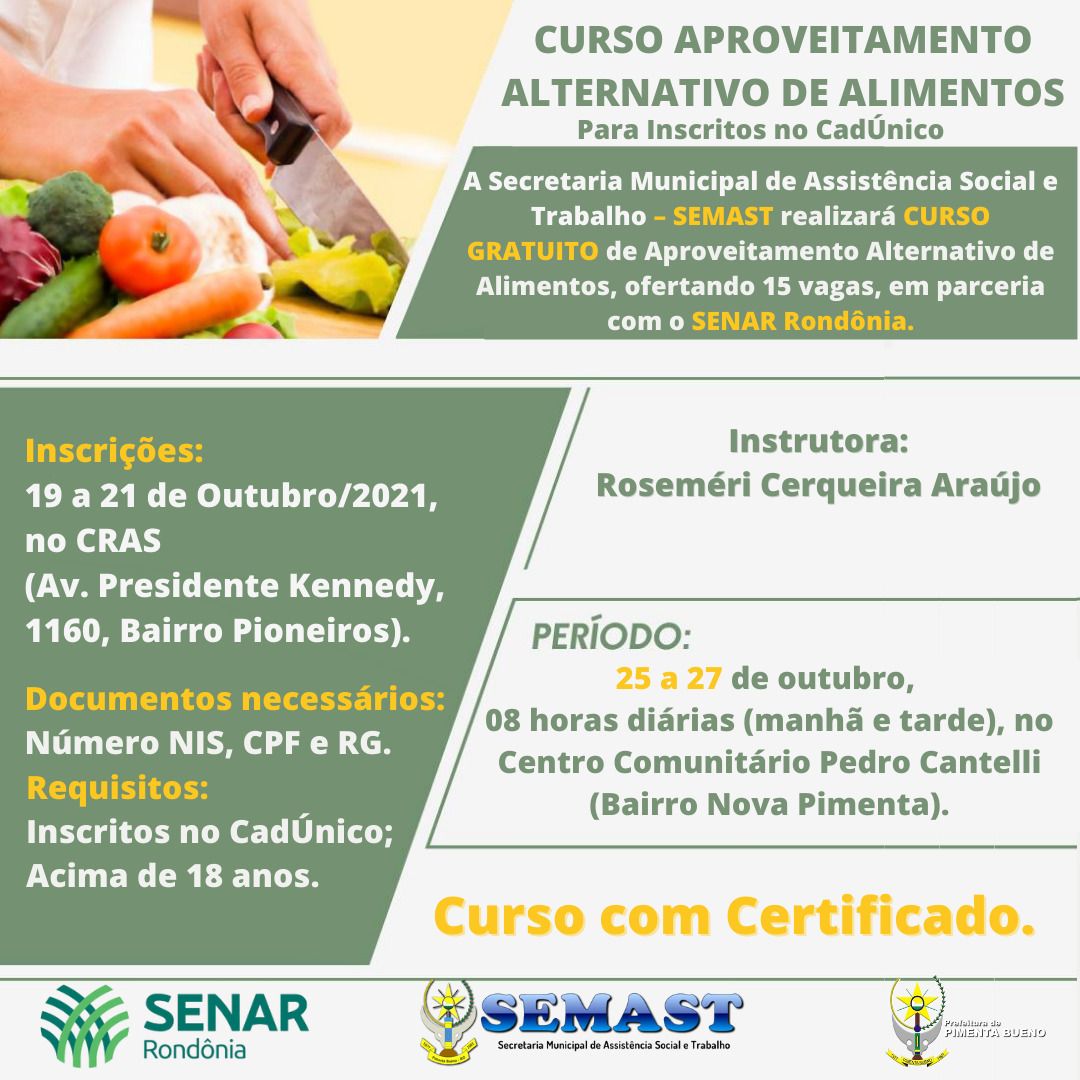 A Secretaria Municipal de Assistência Social e Trabalho – SEMAST realizará CURSO GRATUITO de Aproveitamento Alternativo de Alimentos, ofertando 15 vagas, em parceria com o SENAR Rondônia.