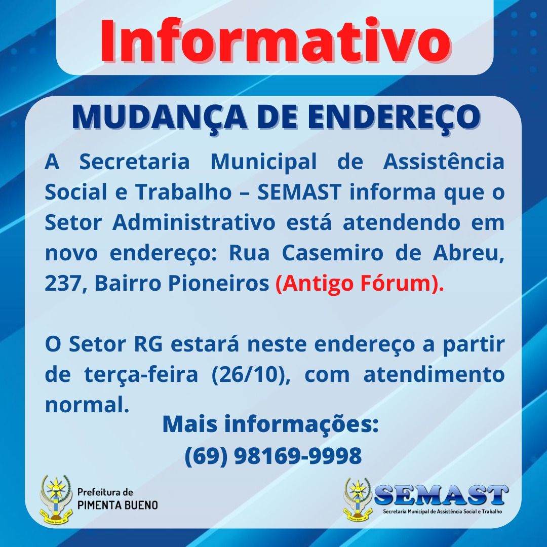 Setor Administrativo está atendendo em novo endereço: Rua Casemiro de Abreu,