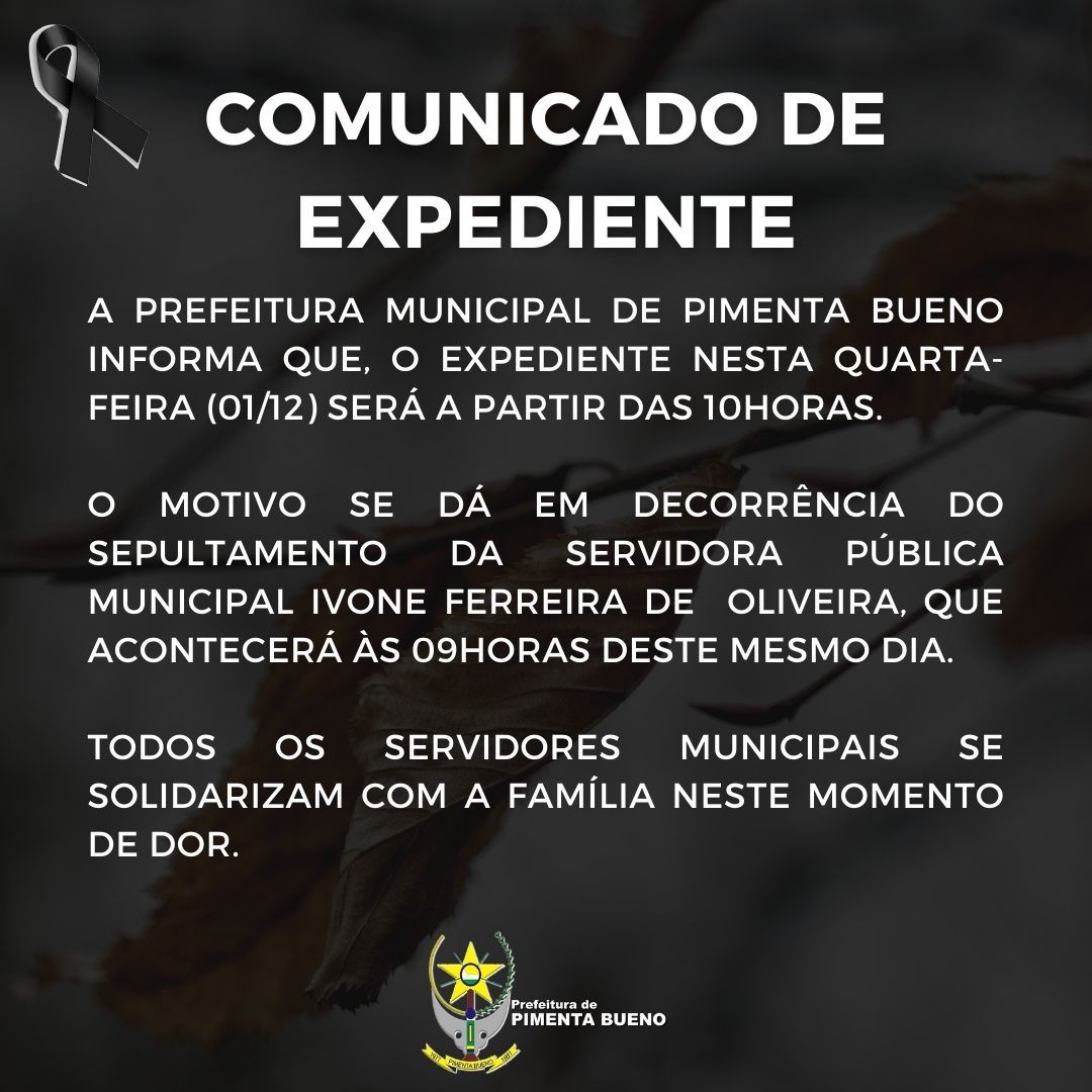 Prefeitura Municipal de Pimenta Bueno informa que, o expediente nesta quarta-