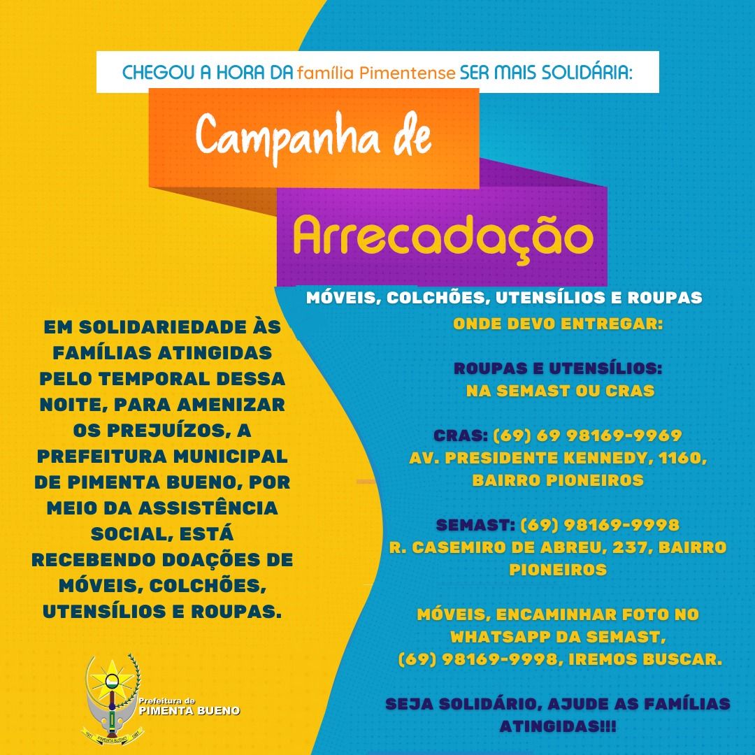 Em solidariedade às famílias atingidas pelo temporal dessa noite, para amenizar os prejuízos, a Prefeitura Municipal de Pimenta Bueno, por meio da Assistência Social, está recebendo doações de móveis, colchões, utensílios e roupas.