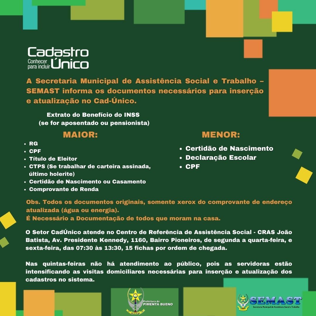 A Secretaria Municipal de Assistência Social e Trabalho – SEMAST informa os documentos necessários para inserção e atualização no Cad-Único.