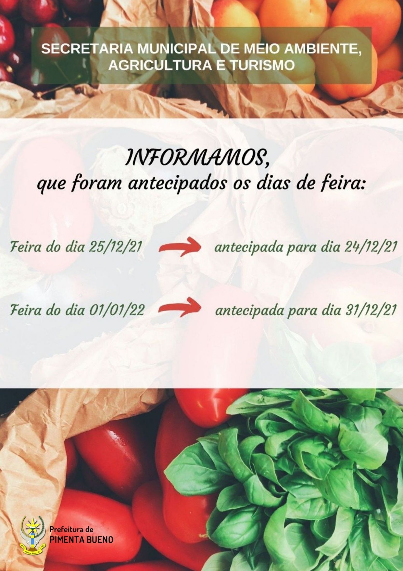 A Prefeitura de Pimenta Bueno por meio da Secretaria municipal de Meio Ambiente, Agricultura e Turismo informa que foram antecipados os dias das feiras de sábado.