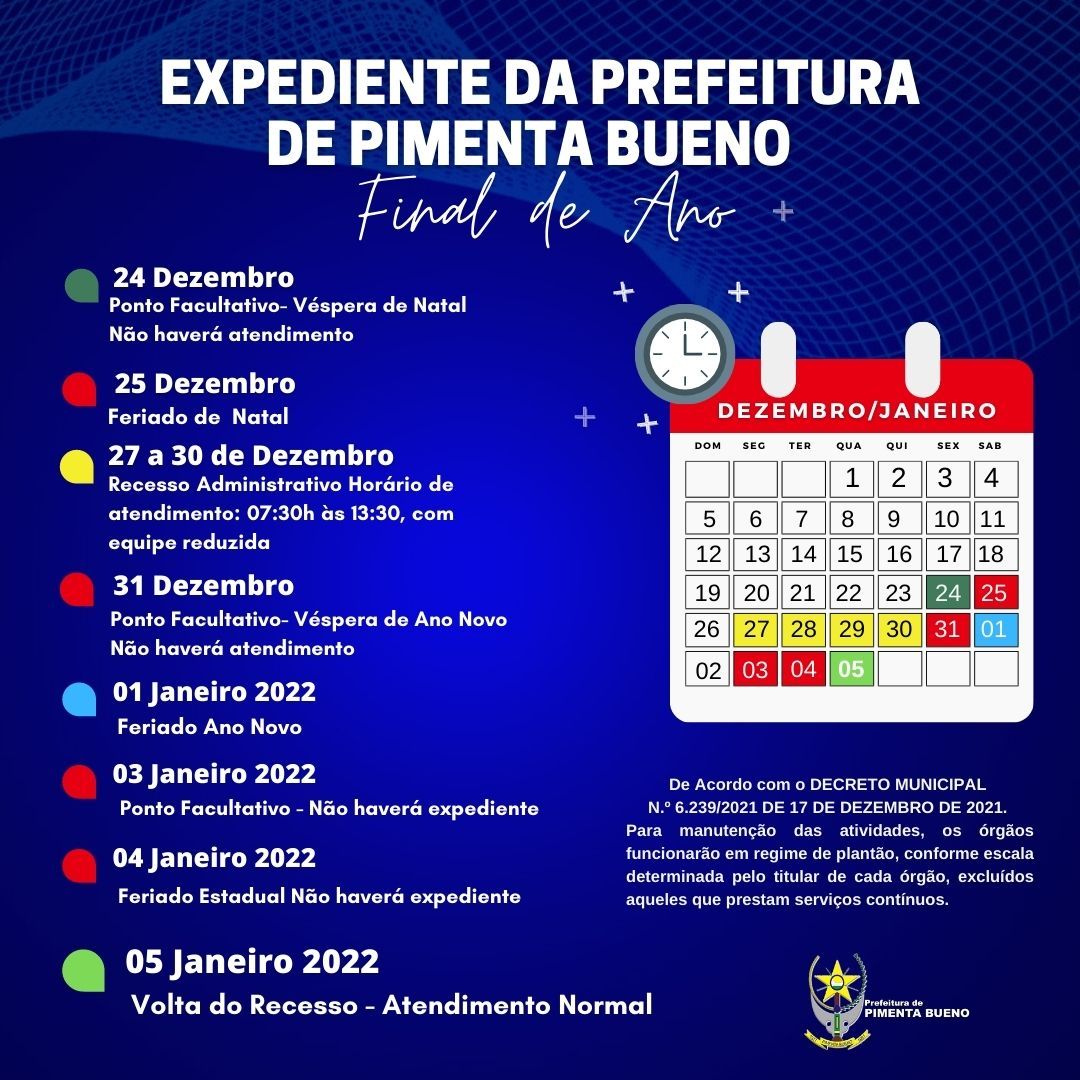CONFIRA O EXPEDIENTE DA PREFEITURA DE PIMENTA BUENO NESTE FIM DE ANO :