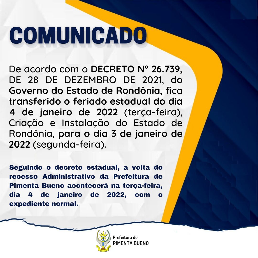 De acordo com o DECRETO N° 26.739, DE 28 DE DEZEMBRO DE 2021, do Governo do Estado de Rondônia, fica transferido o feriado estadual do dia 4 de janeiro de 2022 (terça-feira), Criação e Instalação do Estado de Rondônia, para o dia 3 de janeiro de 2022 (segunda-feira).