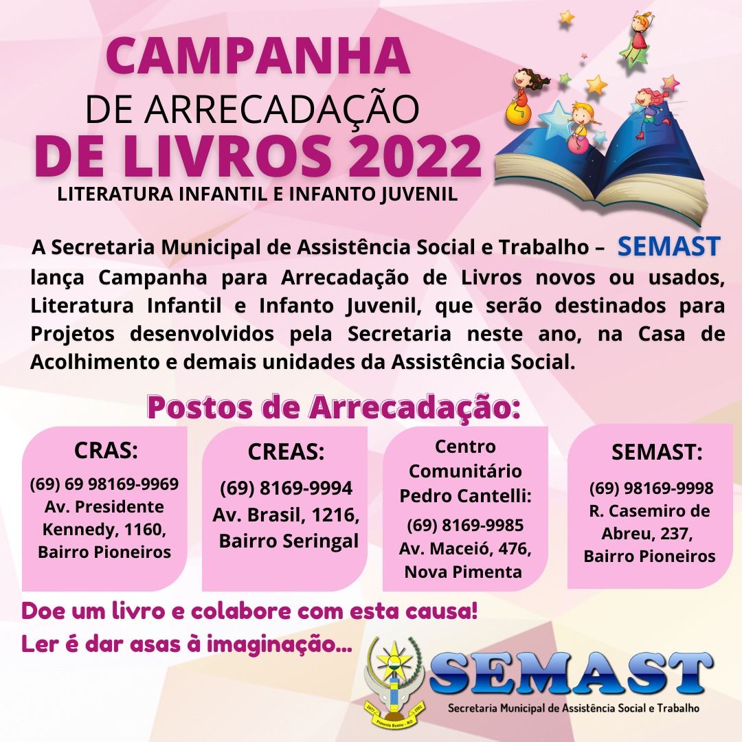 A Secretaria Municipal de Assistência Social e Trabalho – SEMAST lança Campanha para Arrecadação de Livros novos ou usados, Literatura Infantil e Infanto Juvenil, que serão destinados para Projetos desenvolvidos pela Secretaria neste ano, na Casa de Acolhimento e demais unidades da Assistência Social.
