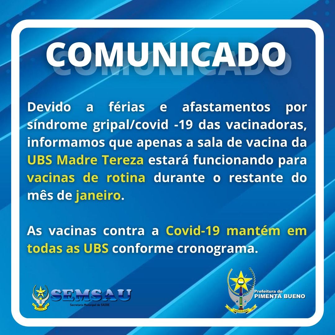 Devido a férias e afastamentos por síndrome gripal/Covid -19 das vacinadoras, informamos que apenas a sala de vacina da UBS Madre Tereza estará funcionando para vacinas de rotina durante o restante do mês de janeiro.