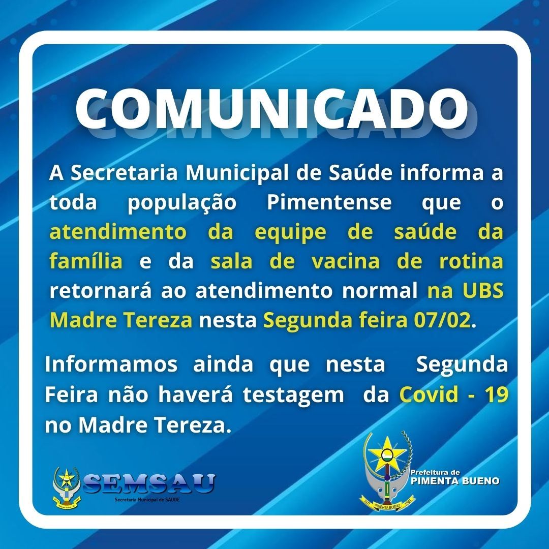 A Secretaria Municipal de Saúde informa a toda população Pimentense que o atendimento da equipe de saúde da família e da sala de vacina de rotina retornará ao atendimento normal na UBS Madre Tereza nesta Segunda-feira 07/02.