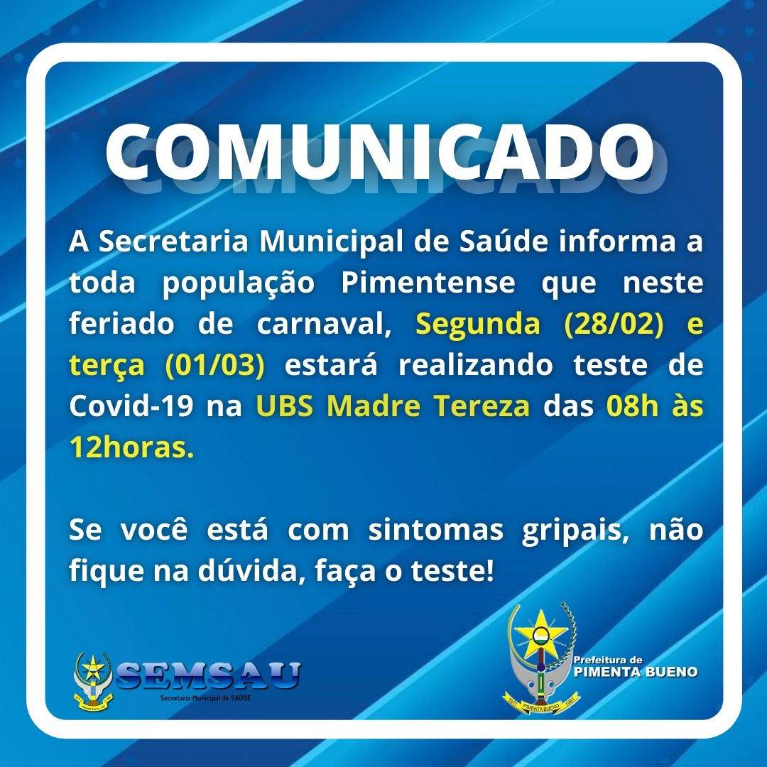 A Secretaria Municipal de Saúde informa a toda população Pimentense que neste feriado de carnaval, Segunda (28/02) e terça (01/03) estará realizando teste de Covid-19 na UBS Madre Tereza das 08h às 12horas.