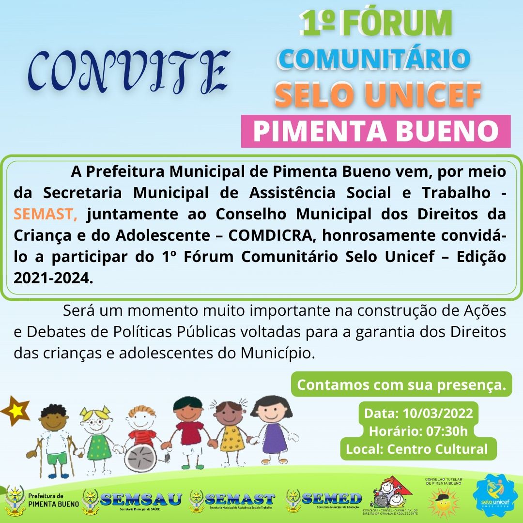 A Prefeitura Municipal de Pimenta Bueno vem, por meio da Secretaria Municipal de Assistência Social e Trabalho - SEMAST, juntamente ao Conselho Municipal dos Direitos da Criança e do Adolescente – COMDICRA, honrosamente convidá-lo a participar do 1º Fórum Comunitário Selo Unicef – Edição 2021-2024.