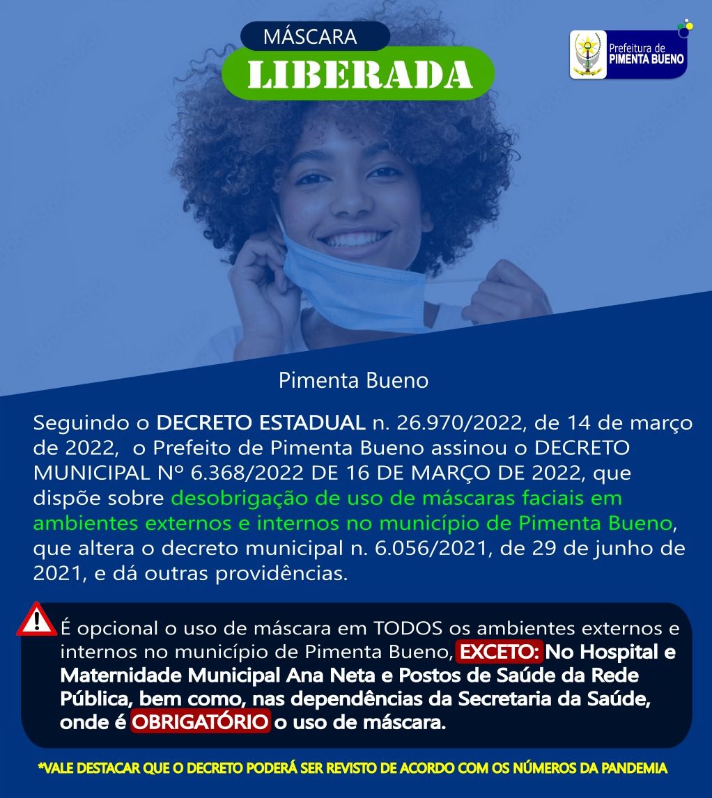 Seguindo o Decreto Estadual n. 26.970/2022, de 14 de março de 2022, a Prefeitura de Pimenta Bueno assinou o DECRETO MUNICIPAL Nº 6.368/2022 DE 16 DE MARÇO DE 2022, que dispõe sobre desobrigação de uso de máscaras faciais em ambientes externos e internos no município de Pimenta Bueno, que altera o decreto municipal n. 6.056/2021, de 29 de junho de 2021, e dá outras providências.