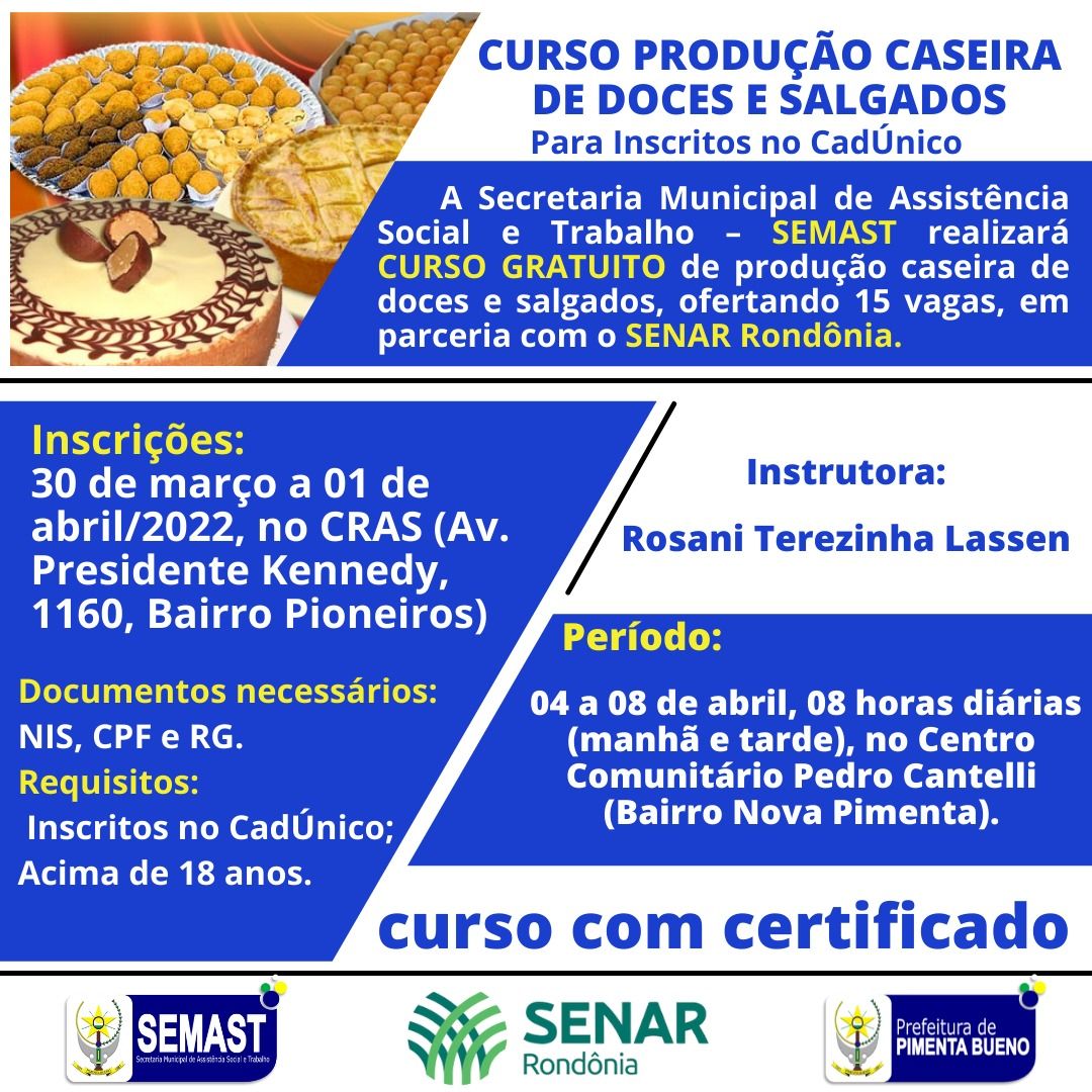 A Secretaria Municipal de Assistência Social e Trabalho – SEMAST realizará CURSO GRATUITO de Produção Caseira de Doces e Salgados, ofertando 15 vagas, em parceria com o SENAR Rondônia.
