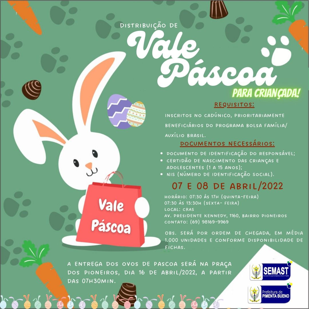 A Secretaria Municipal de Assistência Social e Trabalho – SEMAST informa que estará distribuindo Vale Páscoa para os responsáveis, destinados as crianças e adolescentes cujas famílias estejam em atendimento nas unidades da assistência social. Será por ordem de chegada, em média 1.000 unidades, e conforme disponibilidade de fichas.