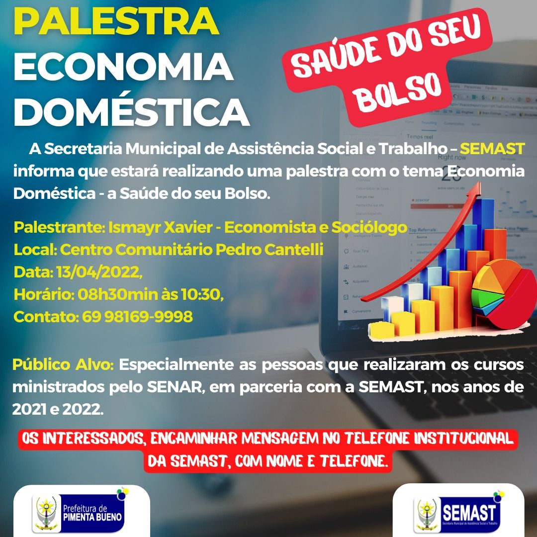 A Secretaria Municipal de Assistência Social e Trabalho – SEMAST informa que estará realizando uma palestra com o tema Economia Doméstica - a Saúde do seu Bolso, Palestrante Ismayr Xavier - Economista e Sociólogo, para atender especialmente as pessoas que realizaram os cursos ministrados pelo SENAR, em parceria com a SEMAST, nos anos de 2021 e 2022, visando a continuidade no auxílio às famílias para superação da vulnerabilidade social.