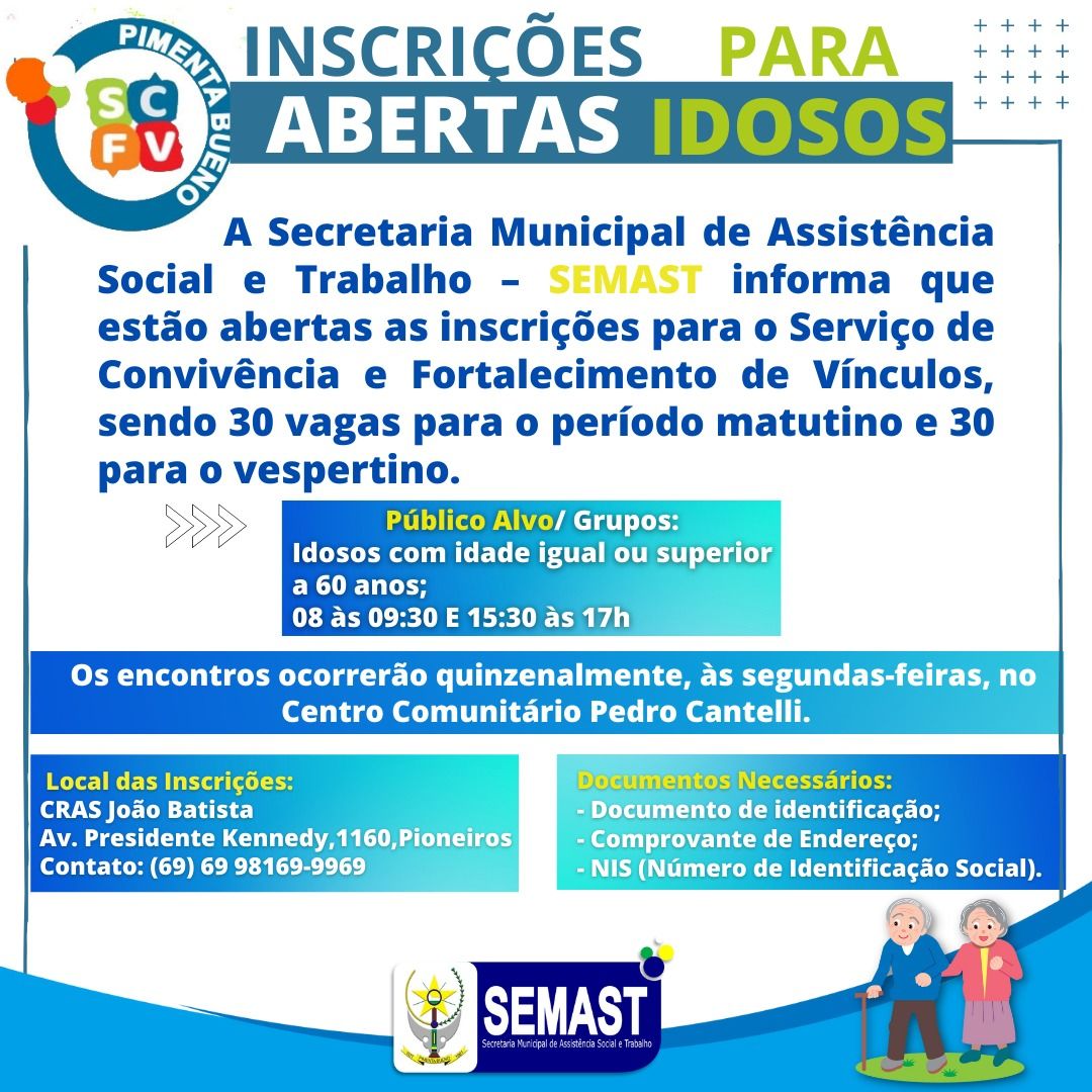 A Secretaria Municipal de Assistência Social e Trabalho – SEMAST informa que estão abertas as inscrições para o Serviço de Convivência e Fortalecimento de Vínculos para idosos, sendo 30 vagas para o período matutino e 30 para o vespertino.