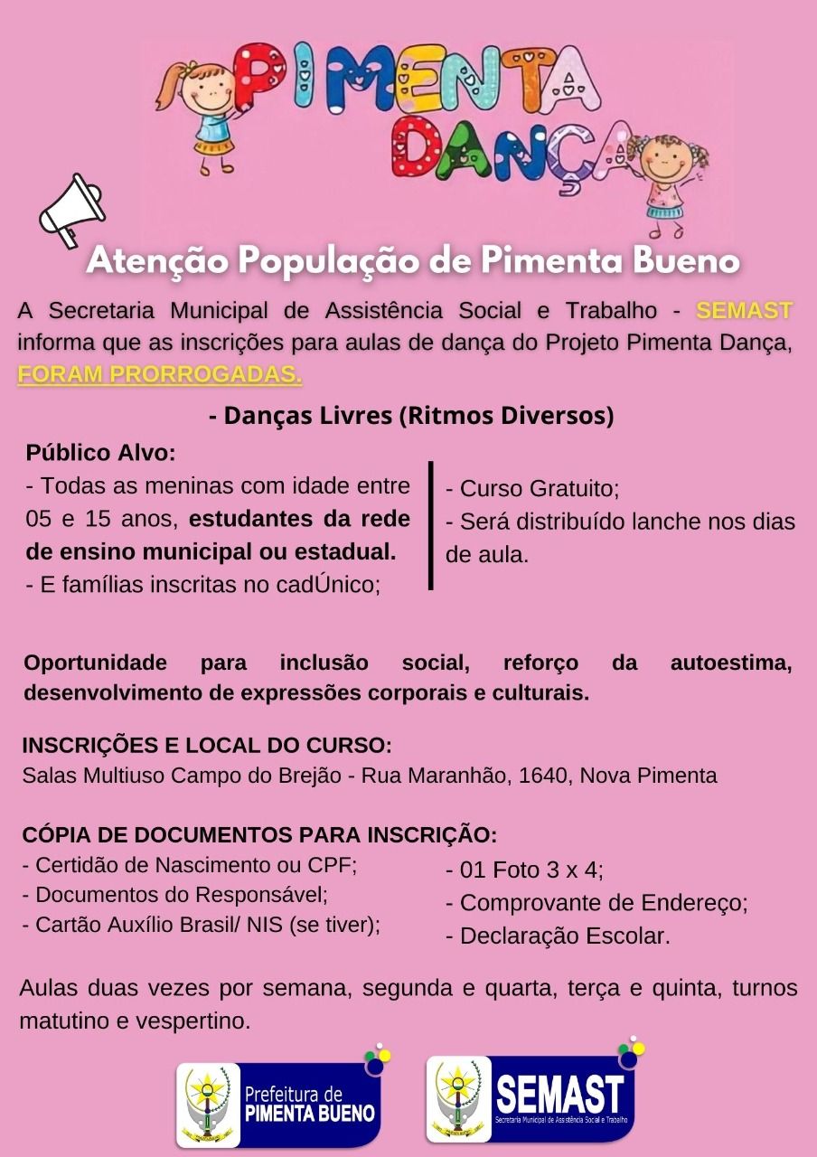 A Secretaria Municipal de Assistência Social e Trabalho - SEMAST informa que as inscrições para aulas de dança do Projeto Pimenta Dança, FORAM PRORROGADAS.