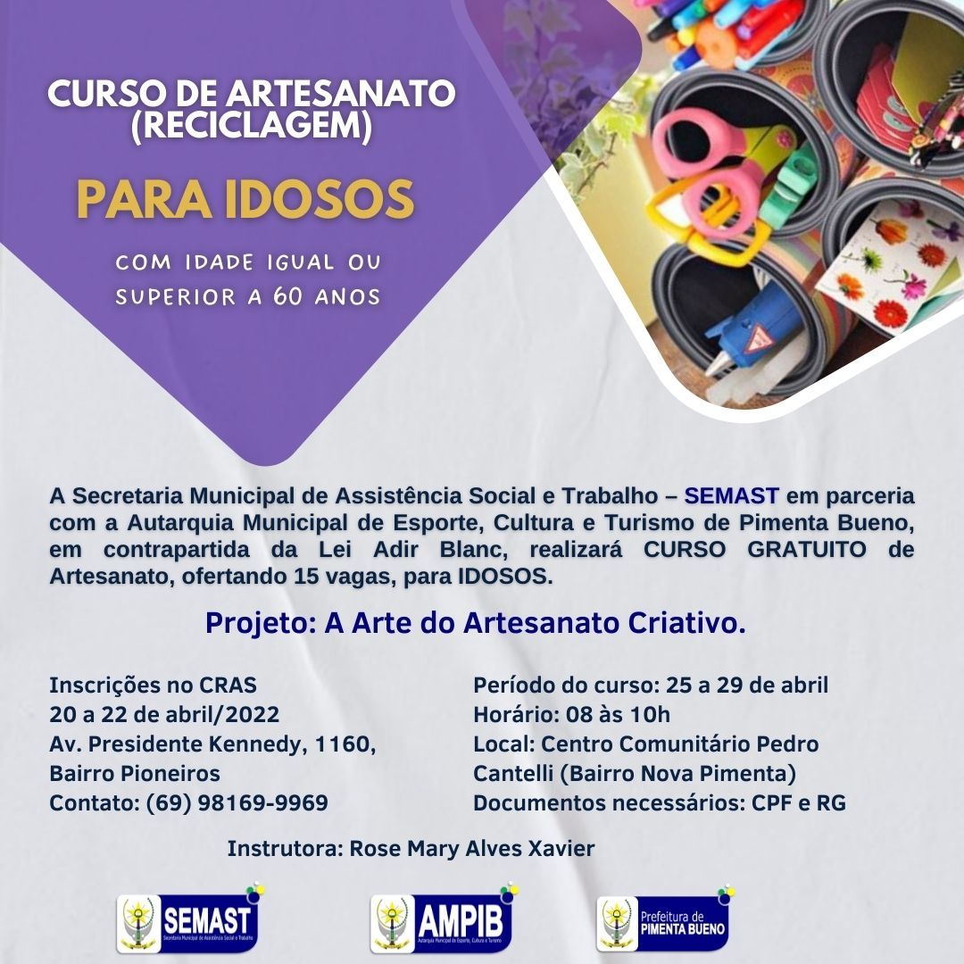 A Secretaria Municipal de Assistência Social e Trabalho – SEMAST em parceria com a Autarquia Municipal de Esporte, Cultura e Turismo de Pimenta Bueno, contrapartida da Lei Adir Blanc, realizará CURSO GRATUITO de Artesanato, ofertando 15 vagas, para idosos.