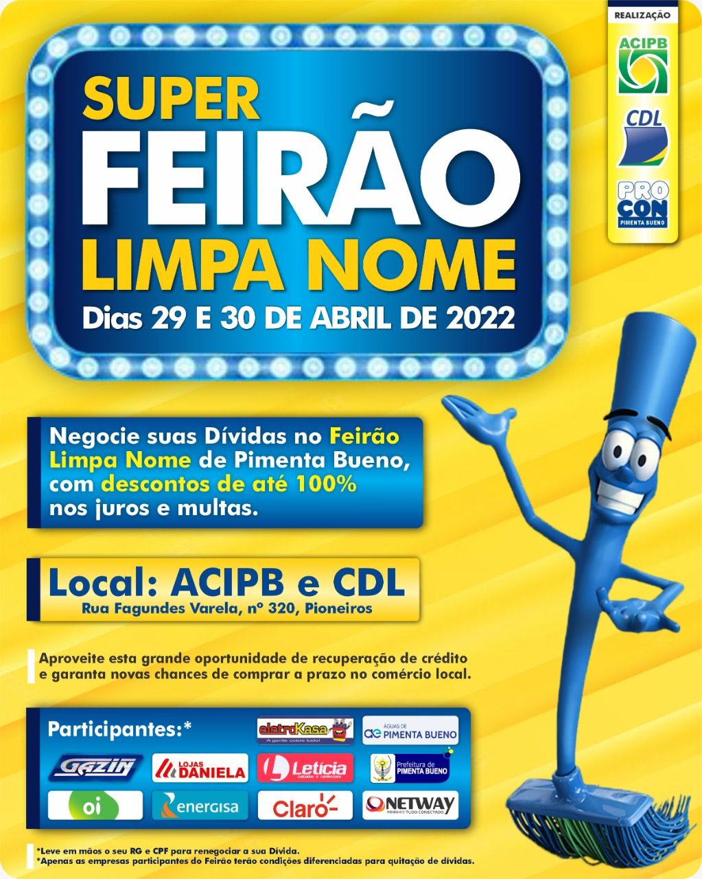 Super Feirão Limpa Nome acontecerá nos dias 29 e 30 de abril, das 08h às 17horas, na Associação Comercial e Industrial e CDL de Pimenta Bueno.