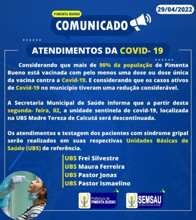 A Secretaria Municipal de Saúde informa que a partir desta segunda- feira, 02, a unidade sentinela de covid-19, localizada na UBS Madre Tereza de Calcutá será descontinuada.