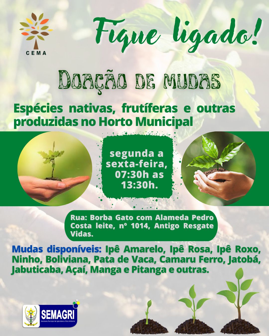 Você gosta de Mudas? A Prefeitura por meio da Semagri, está doando diversas espécies nativas, frutíferas entre outras, Serão até 5 mudas por pessoa, vá até o Horto Municipal e garanta a sua!