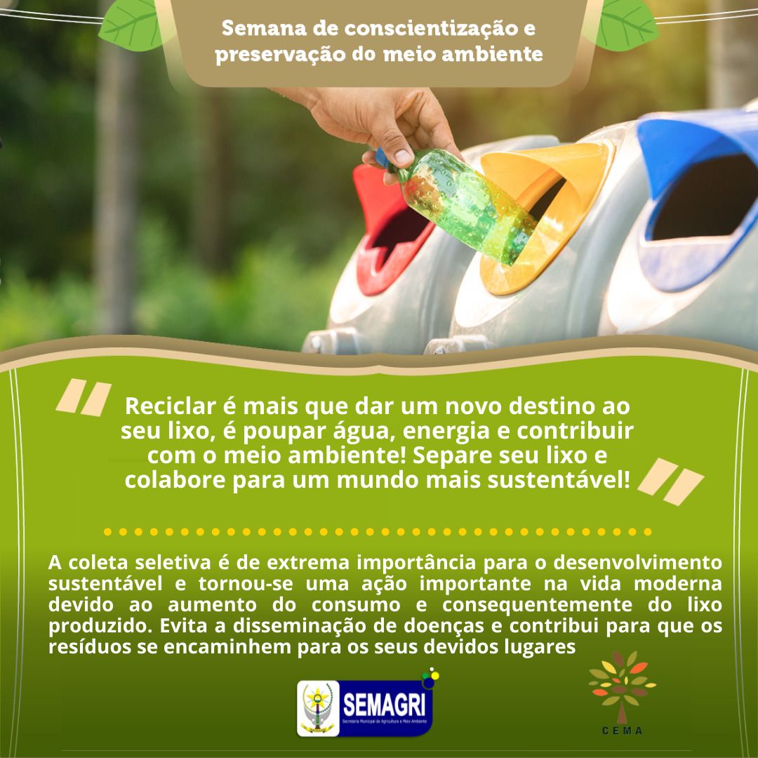 "Reciclar é mais que dar um novo destino ao seu lixo, é poupar água, energia e contribuir com o meio ambiente! Separe seu lixo e colabore para um mundo mais sustentável!".