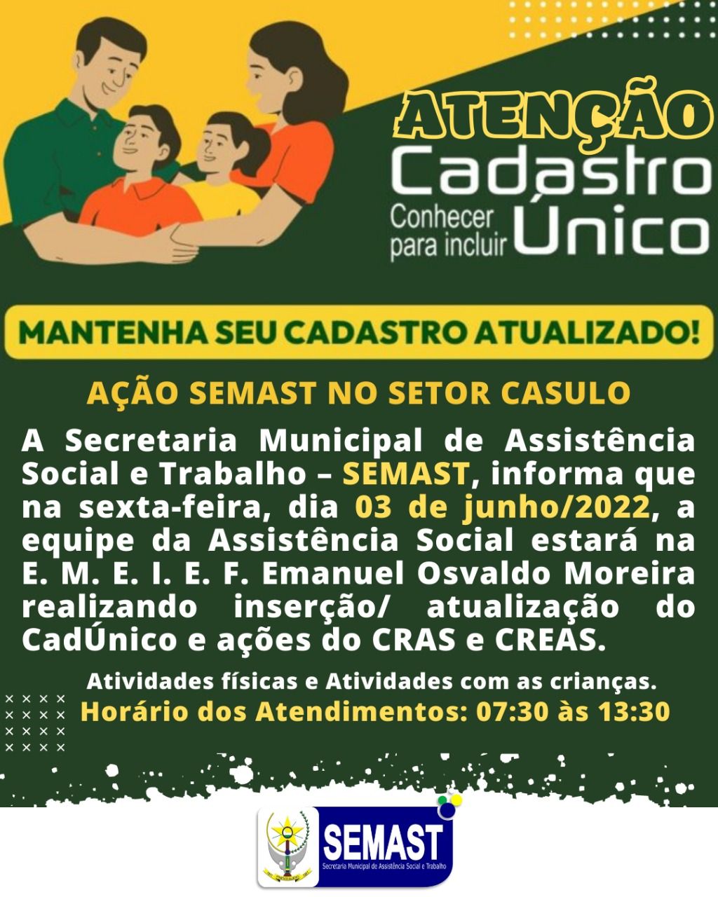A Secretaria Municipal de Assistência Social e Trabalho – SEMAST, informa que na sexta-feira, dia 03 de junho/2022, a equipe da Assistência Social estará na E. M. E. I. E. F. Emanuel Osvaldo Moreira realizando inserção/ atualização do CadÚnico e ações do CRAS e CREAS.