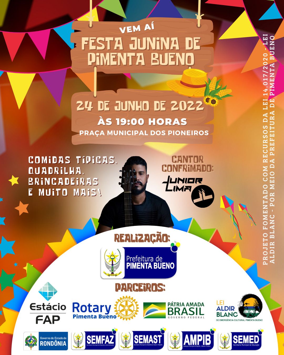 A Festa Junina de Pimenta Bueno acontecerá dia 24 de junho a partir das 19horas na Praça Municipal Dos Pioneiros.
