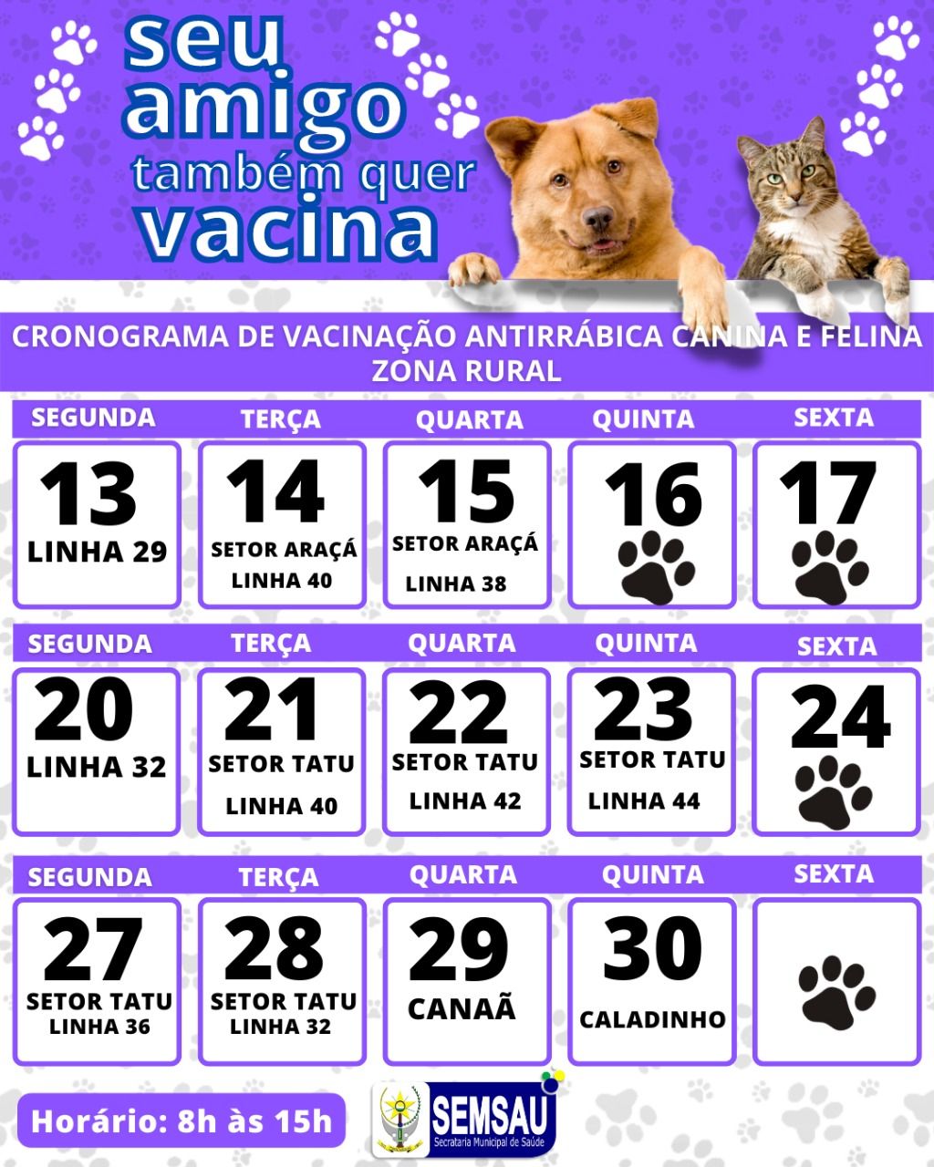 Cronograma de vacinação antirrábica canina e felina - Zona Rural. Confira: