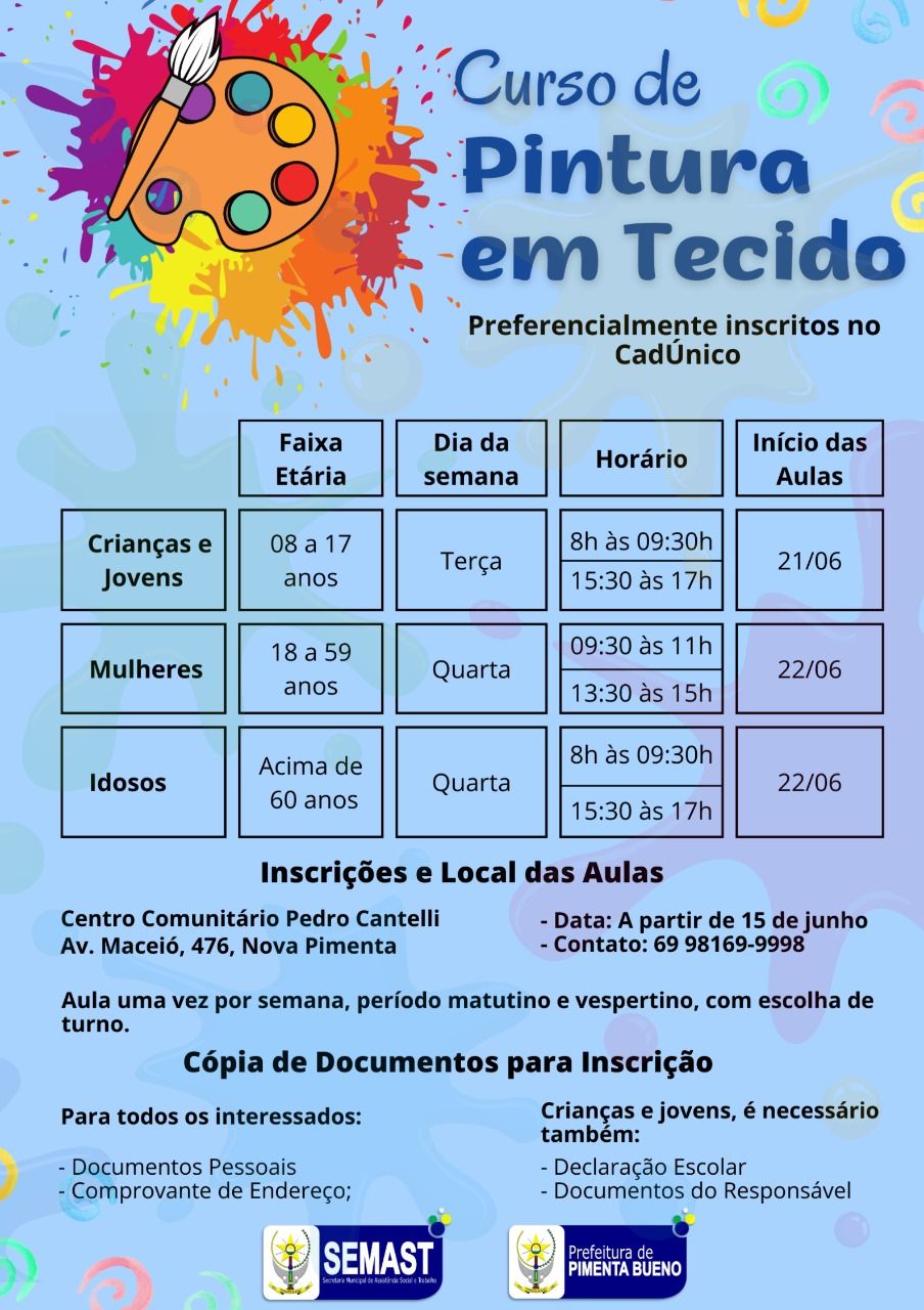 A Prefeitura de Pimenta Bueno por meio da Secretaria Municipal de Assistência Social e Trabalho - Semast irá ofertar curso de PINTURA EM TECIDO, preferencialmente para inscritos no CadÚnico