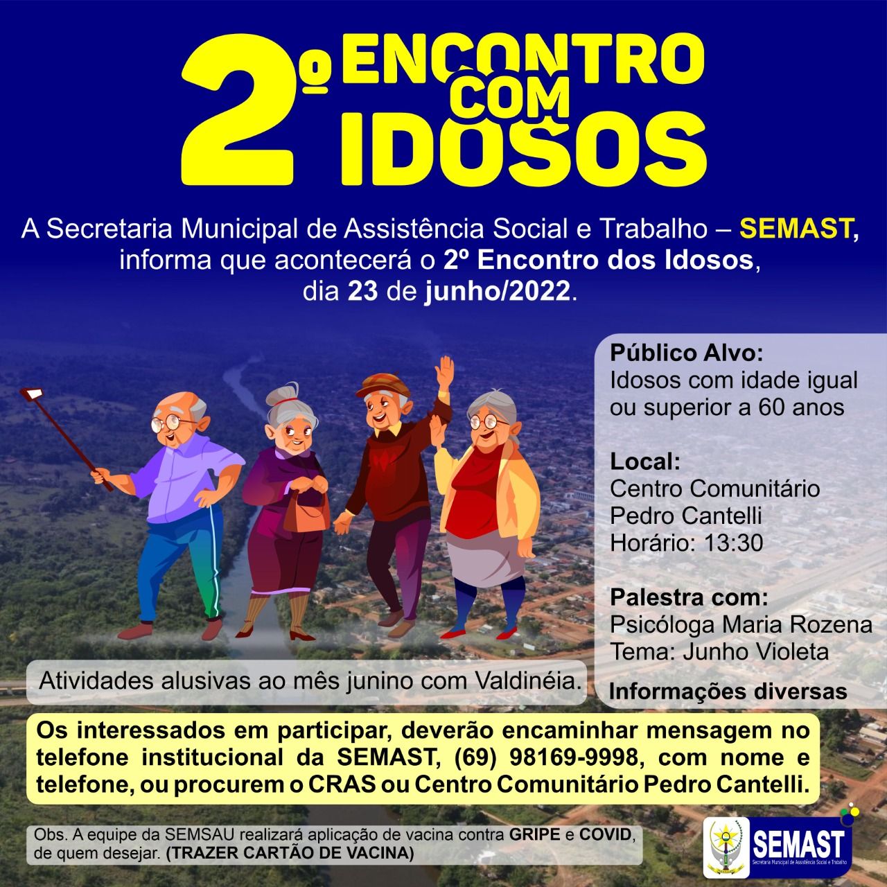 A Secretaria Municipal de Assistência Social e Trabalho – SEMAST, informa que acontecerá o 2º Encontro dos Idosos, dia 23 de junho/2022.