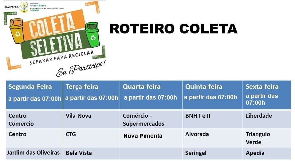 Prefeitura de Pimenta Bueno por meio da Secretaria Municipal de Meio Ambiente e Agricultura, informa que as sacolas recicláveis da Coleta Seletiva serão entregues a partir desta quarta-feira,23. no bairro Nova Pimenta.