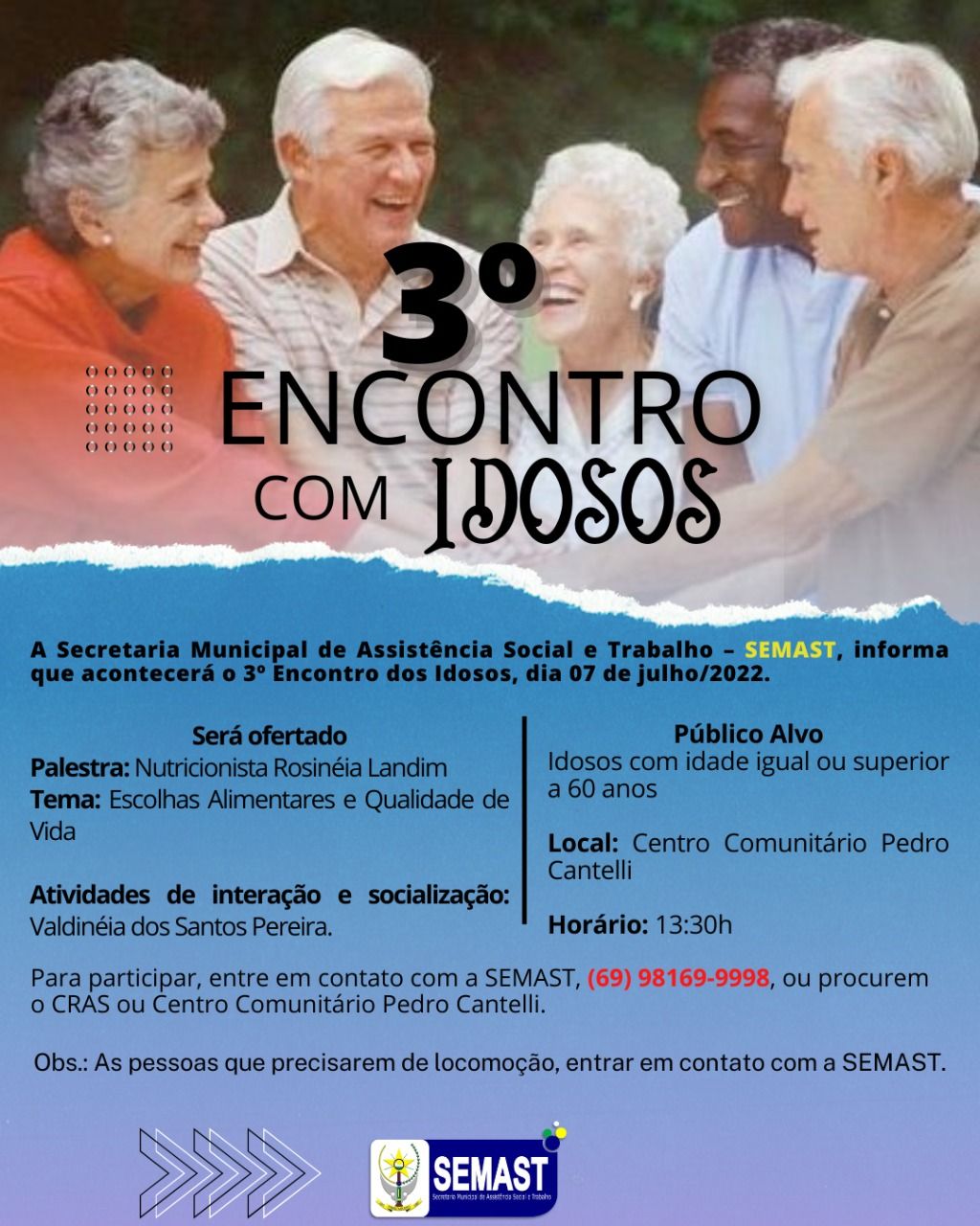 A Secretaria Municipal de Assistência Social e Trabalho – SEMAST, informa que acontecerá o 3º Encontro dos Idosos, dia 07 de julho/2022.