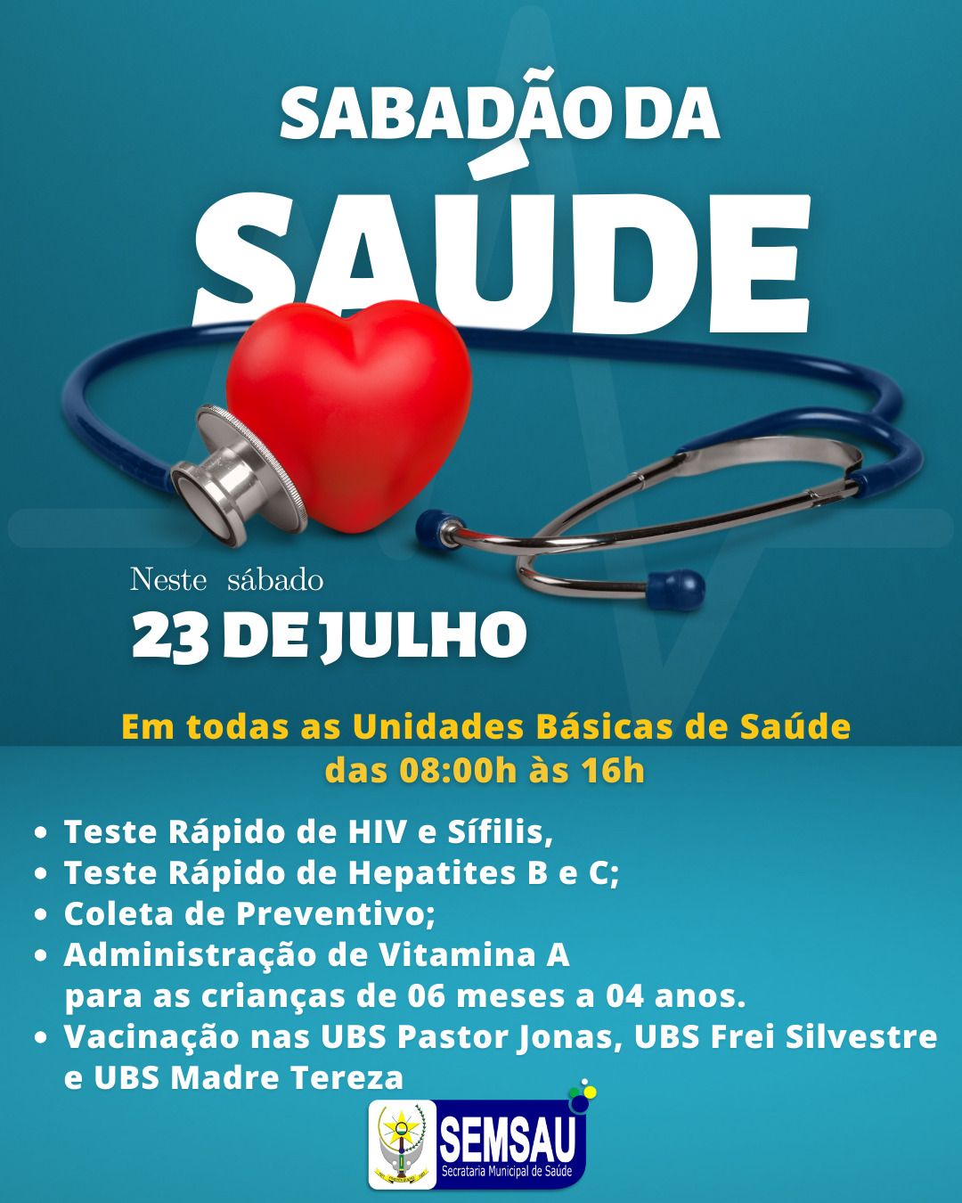 Neste sábado 23 de Julho acontecerá em todas as Unidades Básicas de Saúde o Sabadão da Saúde, com realização de diversos atendimentos, confira: