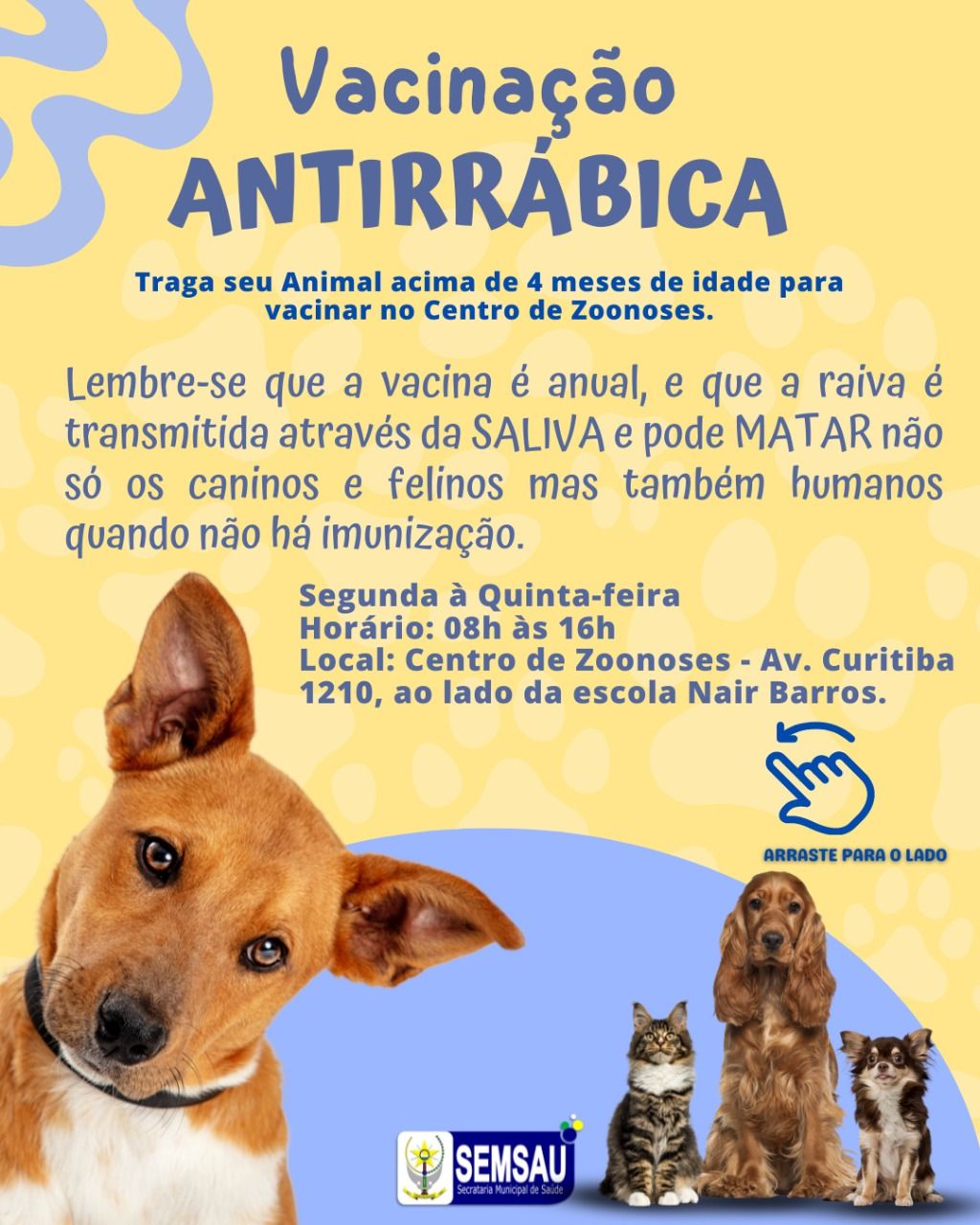 Local: Centro de Zoonoses - Av. Curitiba 1210, ao lado da escola Nair Barros.