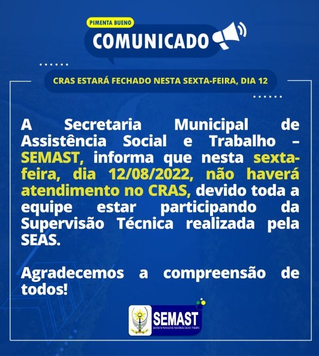 A Secretaria Municipal de Assistência Social e Trabalho – SEMAST, informa que nesta sexta-feira, dia 12/08/2022, não haverá atendimento no CRAS, devido toda a equipe estar participando da Supervisão Técnica realizada pela SEAS.