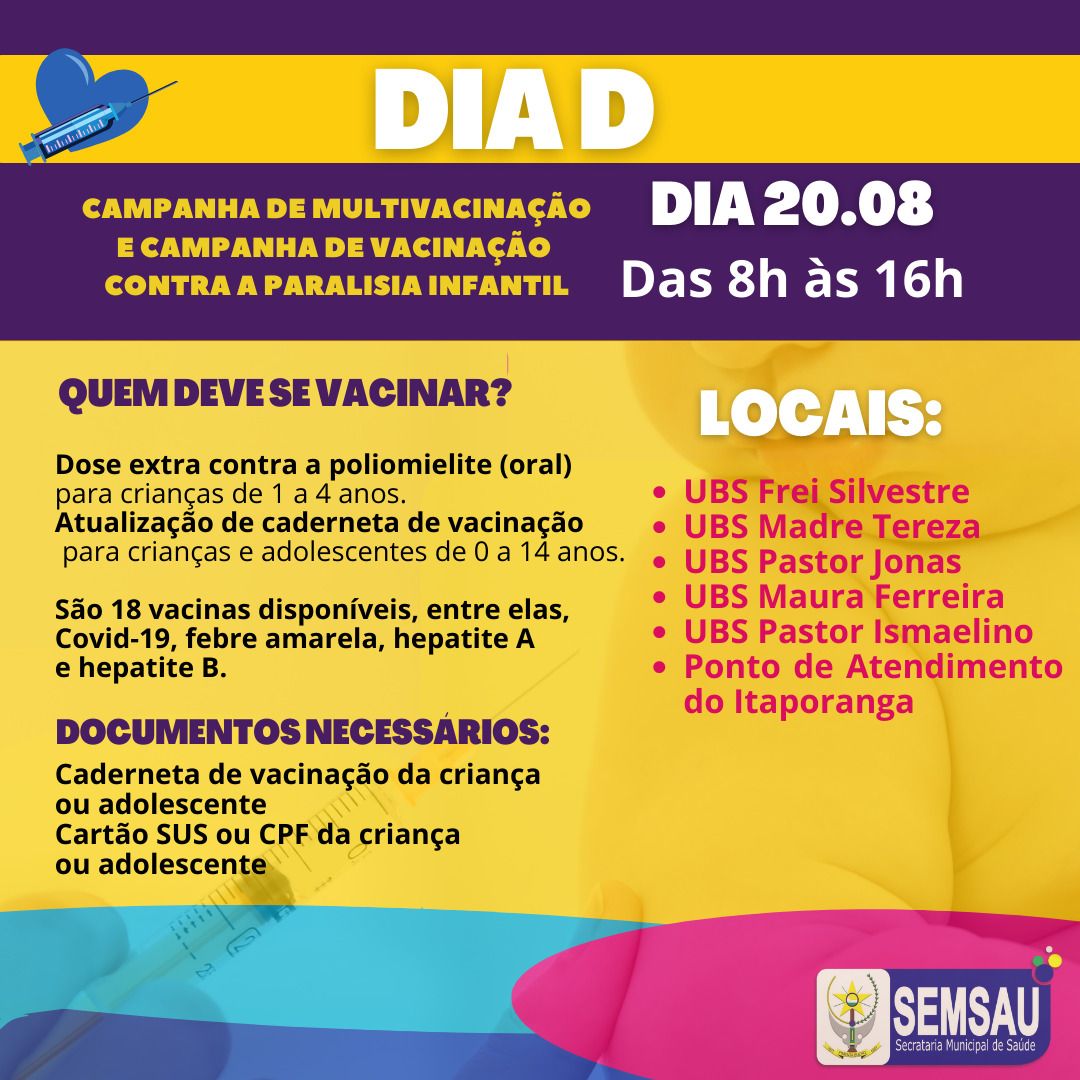 O Dia D da campanha de multivacinação e vacinação contra a paralisia infantil acontece neste sábado dia 20 de agosto em diversas UBS do município. São 18 vacinas disponíveis, entre elas, Covid-19, febre amarela, hepatite A e hepatite B.