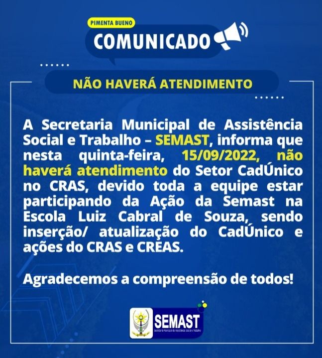 A Secretaria Municipal de Assistência Social e Trabalho – SEMAST, informa que nesta quinta-feira, 15/09/2022, não haverá atendimento do Setor CadÚnico no CRAS, devido toda a equipe estar participando da Ação da Semast na Escola Luiz Cabral de Souza, sendo inserção/ atualização do CadÚnico e ações do CRAS e CREAS.