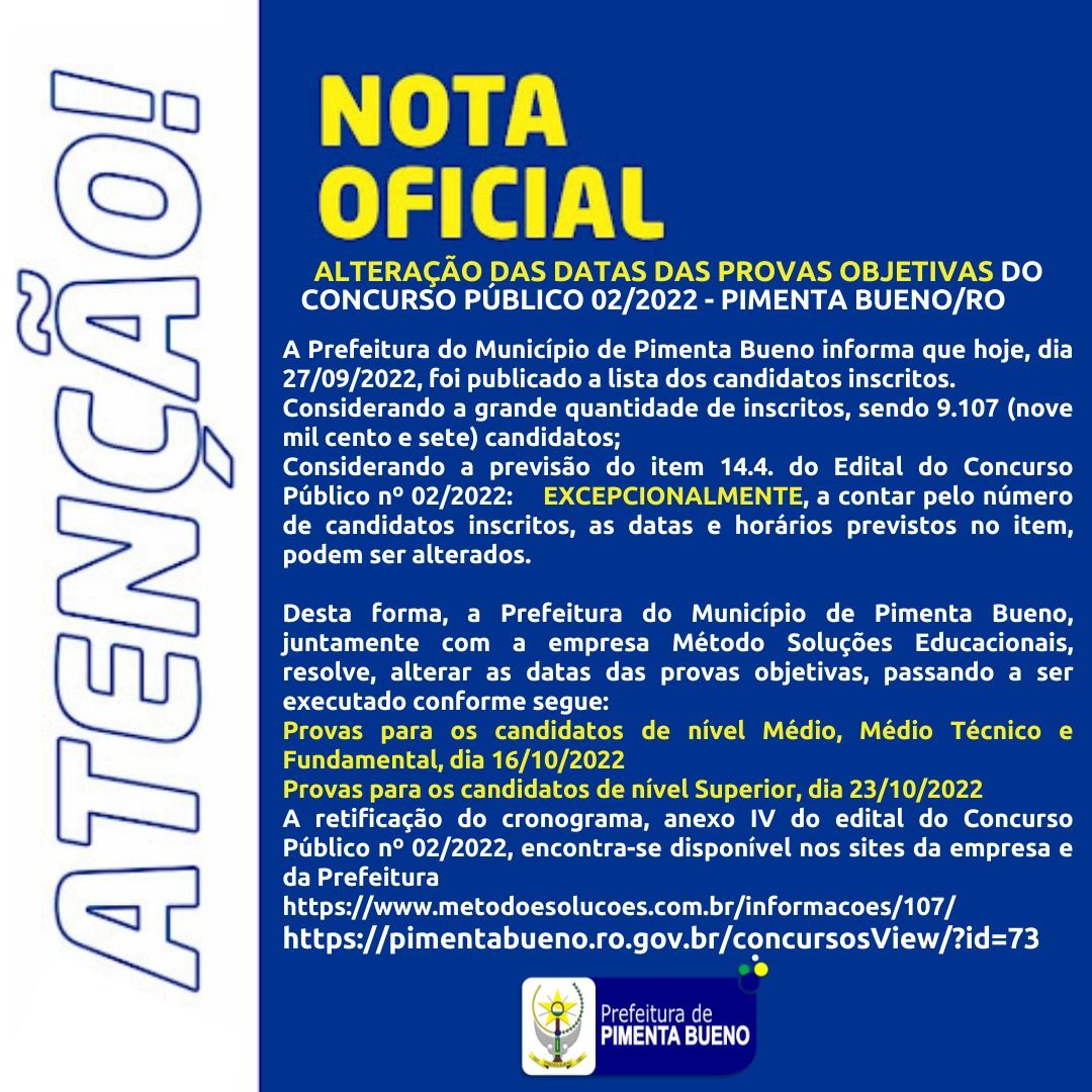 Pimenta Bueno informa que hoje, dia 27/09/2022, foi publicado a lista dos