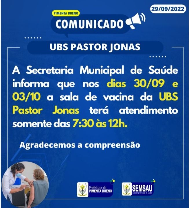 A Secretaria Municipal de Saúde informa que nos dias 30/09 e 03/10 a sala de vacina da UBS Pastor Jonas terá atendimento somente das 7:30 às 12h.