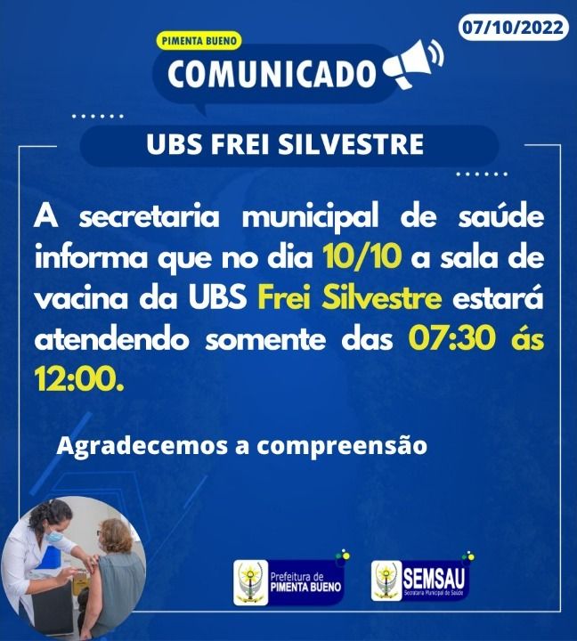 A secretaria municipal de saúde informa que no dia 10/10 a sala de vacina da UBS Frei Silvestre estará atendendo somente das 07:30 ás 12:00.