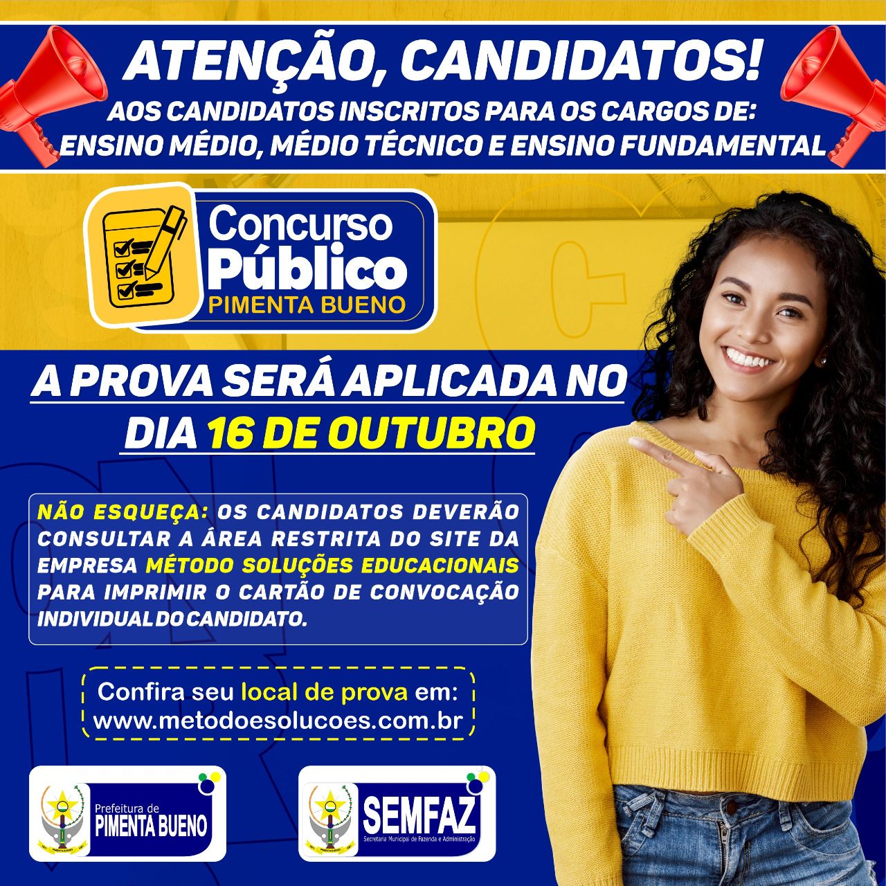 A Prefeitura de Pimenta Bueno comunica aos candidatos que, no próximo domingo, dia 16/10/2022, serão aplicadas as provas objetivas do Concurso Público nº 02/2022, somente, para os cargos de nível médio, médio-técnico e fundamental.
