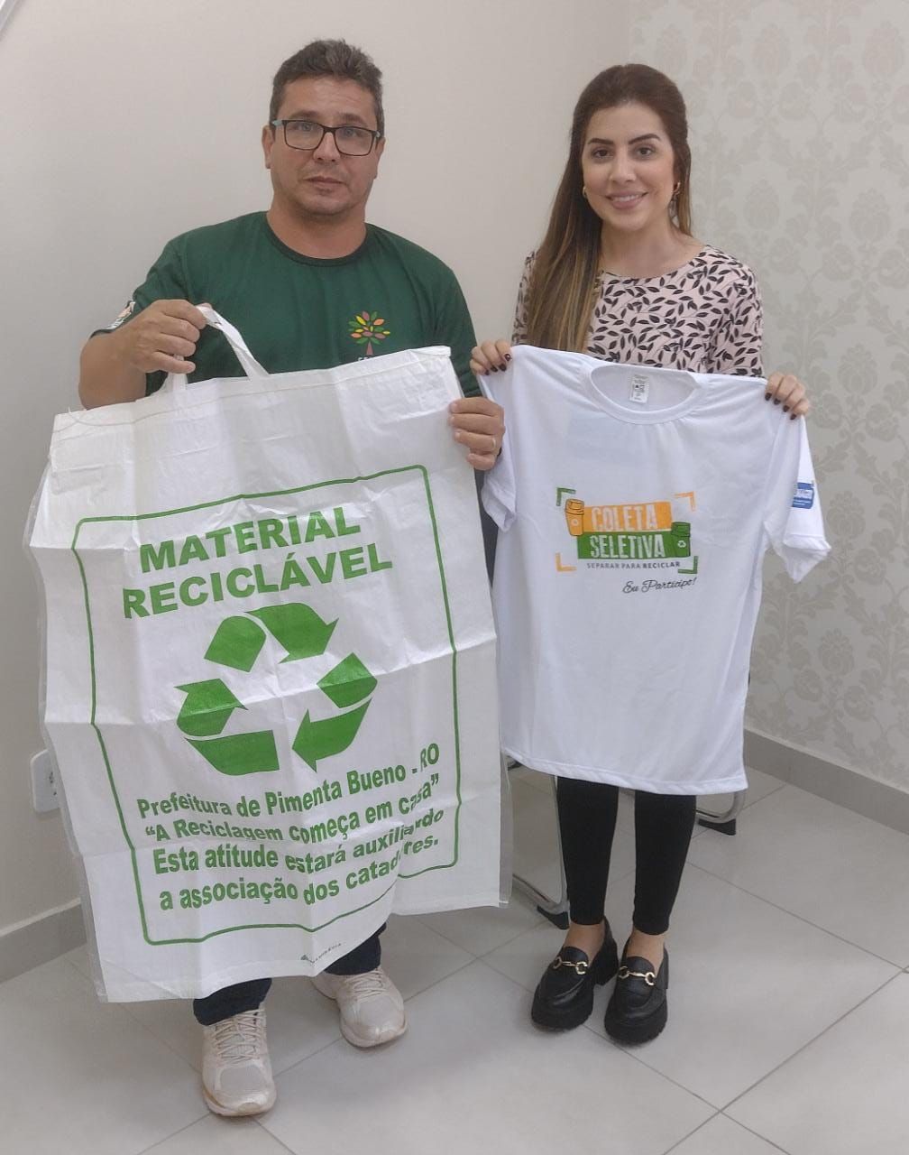 entrega a Dr.ª Uma camiseta do programa da coleta seletiva e a sacola de