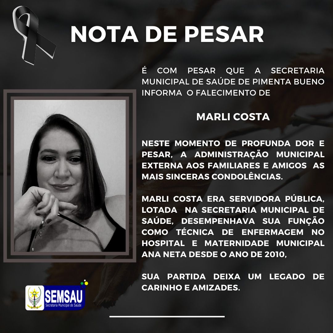 É com pesar que a Secretaria municipal de saúde de Pimenta Bueno informa o falecimento de Marli costa.