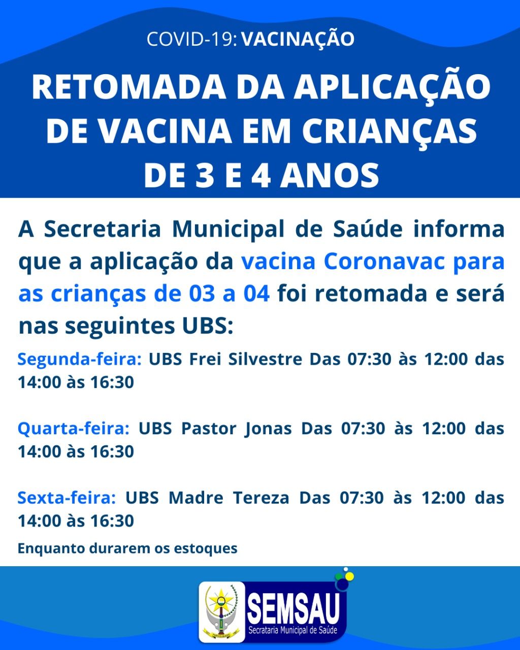 A Secretaria Municipal de saúde informa que a aplicação da