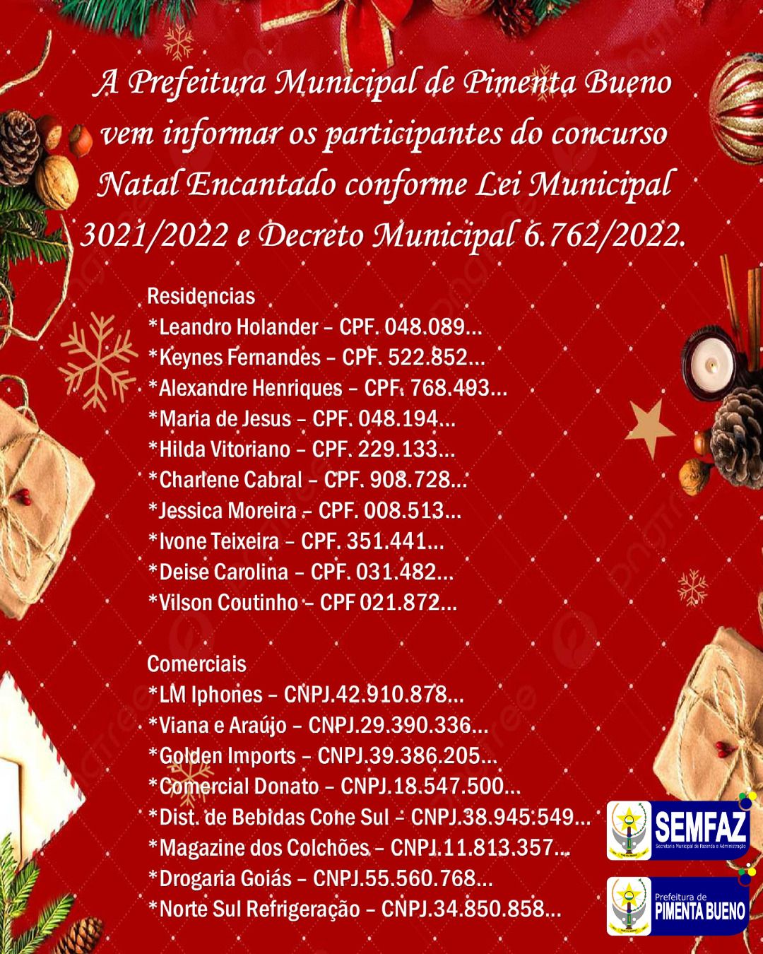 A Prefeitura Municipal de Pimenta-Bueno tem o prazer de informar os participantes do Concurso da melhor Ornamentação Natalina.