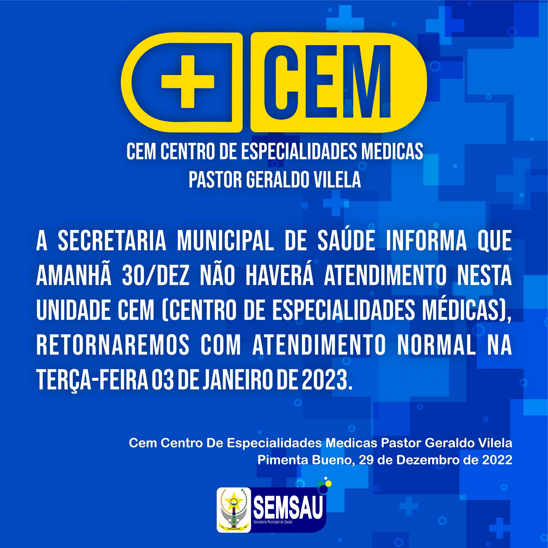 A secretaria municipal de Saúde informa que amanhã 30 de dezembro de 2022 não haverá atendimento nesta unidade CEM (Centro de Especialidades Médicas), retornaremos com atendimento normal na terça-feira 03 de janeiro de 2023.
