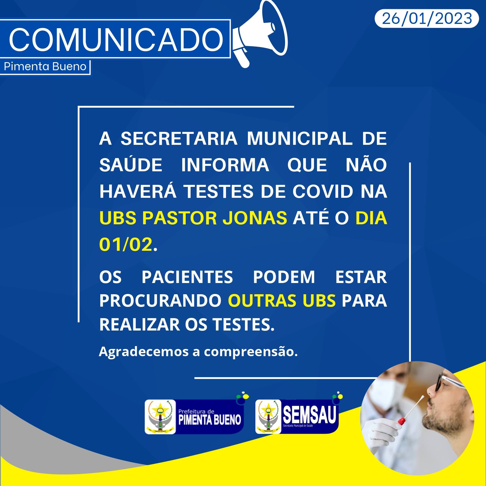 A Secretaria Municipal de Saúde informa que não haverá teste de COVID na UBS Pastor Jonas até o dia 01/02.